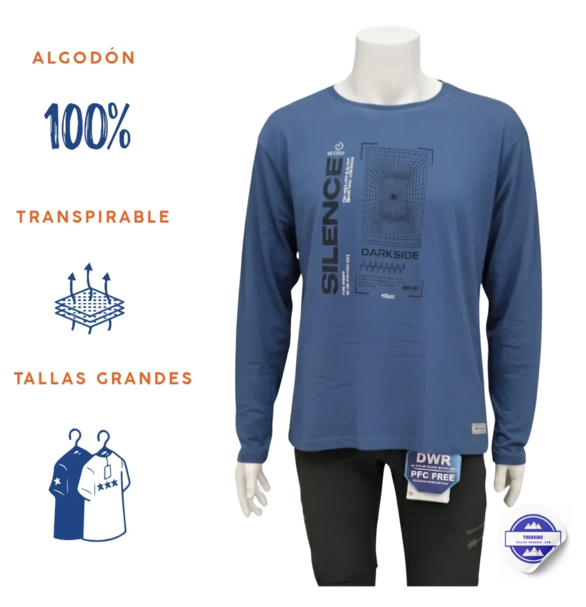 Si buscas una camiseta de manga larga 100% algodón en tallas grandes (3XL–7XL), con tallaje amplio, largo extra y un toque distintivo gracias a sus serigrafías exclusivas en negro, azul índigo y granate, esta Forestal Man es tu aliada para vestir cómodo y con actitud, todos los días.