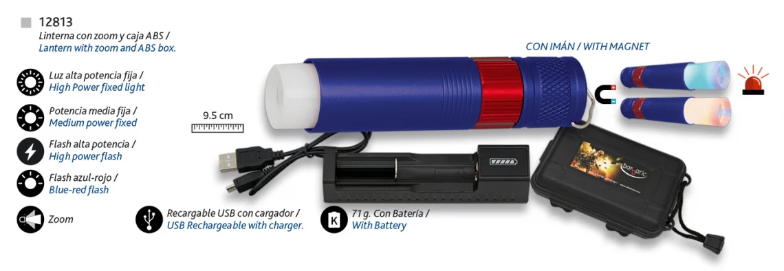 Linterna de mano recargable de pequeñas dimensiones y gran potencia con varios modos de luz y caja estanque